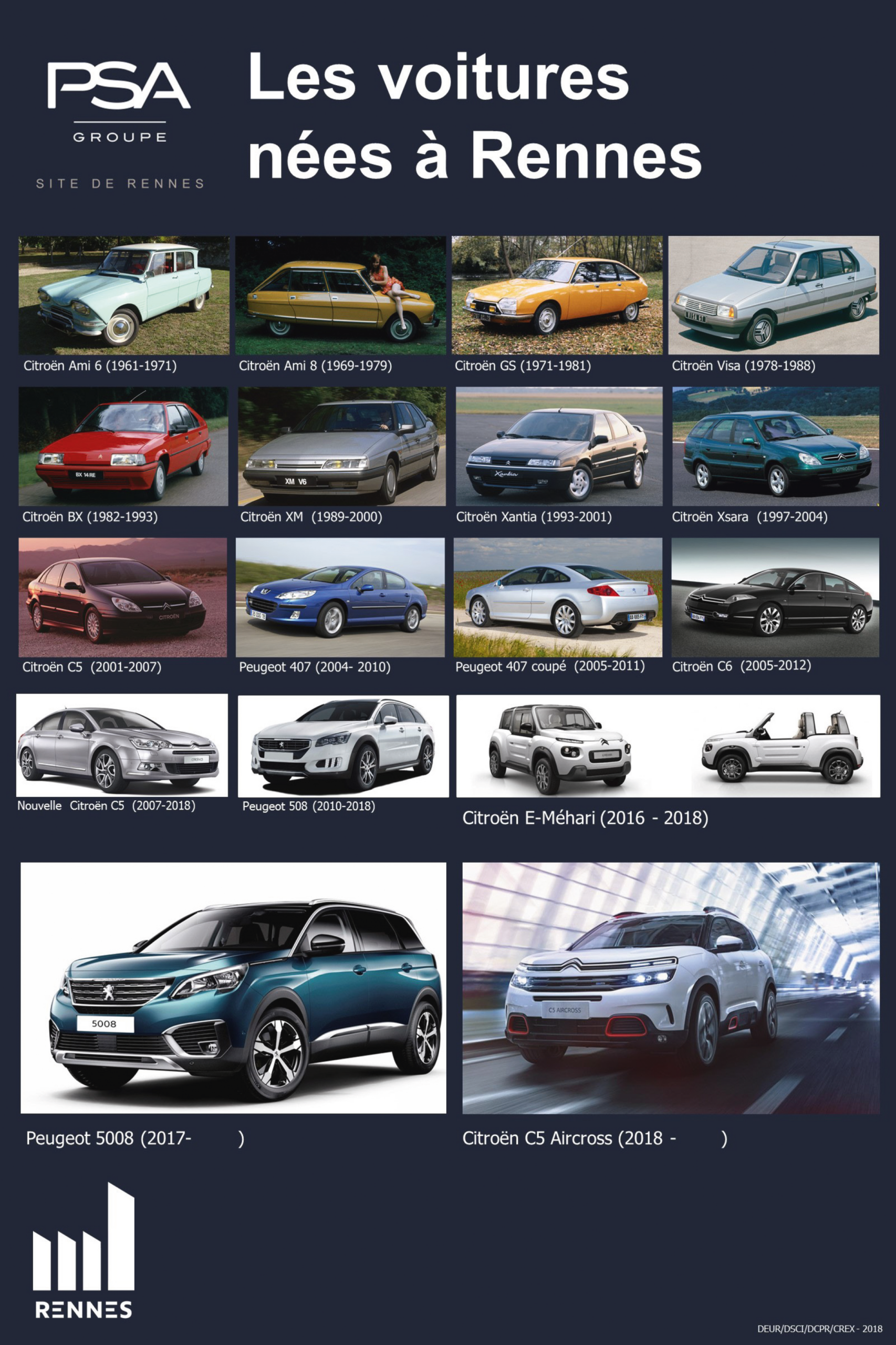 Panorama des voitures produites à La JanaisLes années 60 correspondent à un développement rapide de l’automobile. Au moment où Citroën s’installe à La Janais, seuls 25% des ménages français sont équipés d’une voiture. L’usine commencera à produire des modèles grand public, comme l’Ami 6 : cette voiture est la première à sortir des chaînes de production chartraines le 24 avril 1961. Elle sera produite jusqu’en 1971 à 1,5 million d’exemplaires.